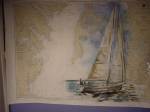 When did Art on Charts begin? Julie Gammack made her first rendition in 2001 when she created a pastel of her husband’s sailboat on a chart of the Chesapeake Bay. He was thrilled to have a portrait of his Bristol 41.1 on the cruising grounds where he sailed and realized Julie had the makings of a business if she could do custom paintings of boats on special charts. From that first effort she learned pastels don’t hold up over time but acrylic paint does . She also learned there is a desire for this kind of memento. Boat brokers have found Art on Charts to be an ideal commissioning gift for higher-end yacht clients because when hung on a wall the painting and yacht become a topic of conversation.